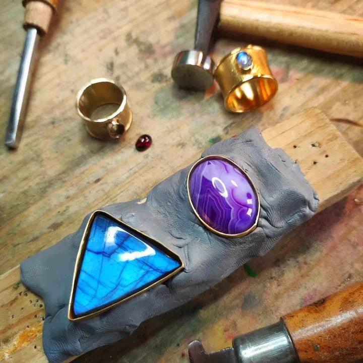 Colgante fabricado a mano con un Labradorita procedente de Madagascar. También se puede fabricar con una Azurita procedente de Chile.