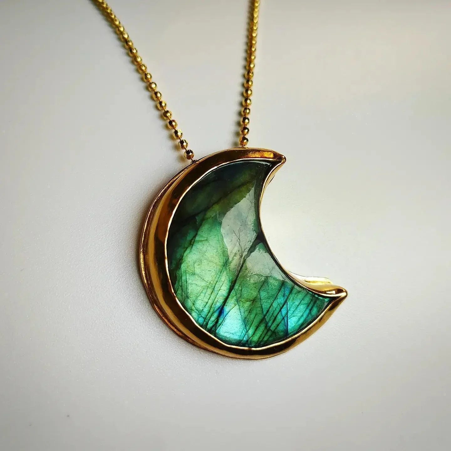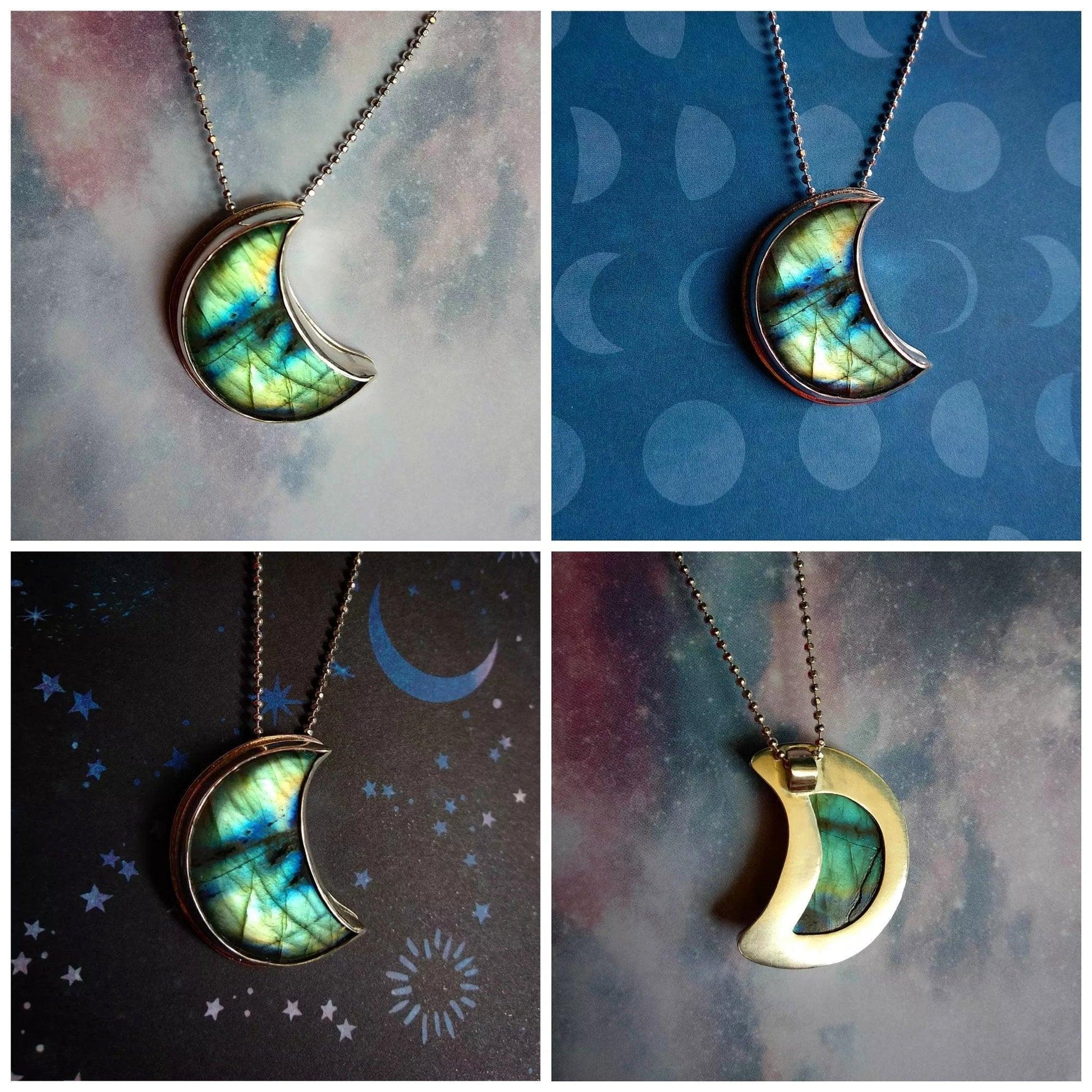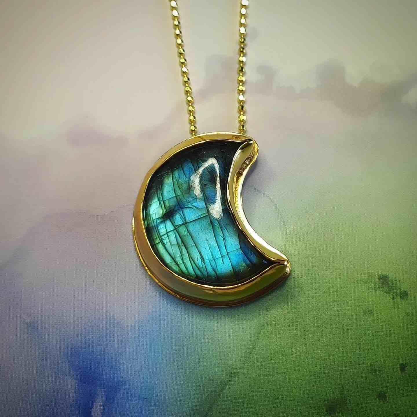 Colgante fabricado a mano con una Labradorita en forma de luna procedente de Madagascar.