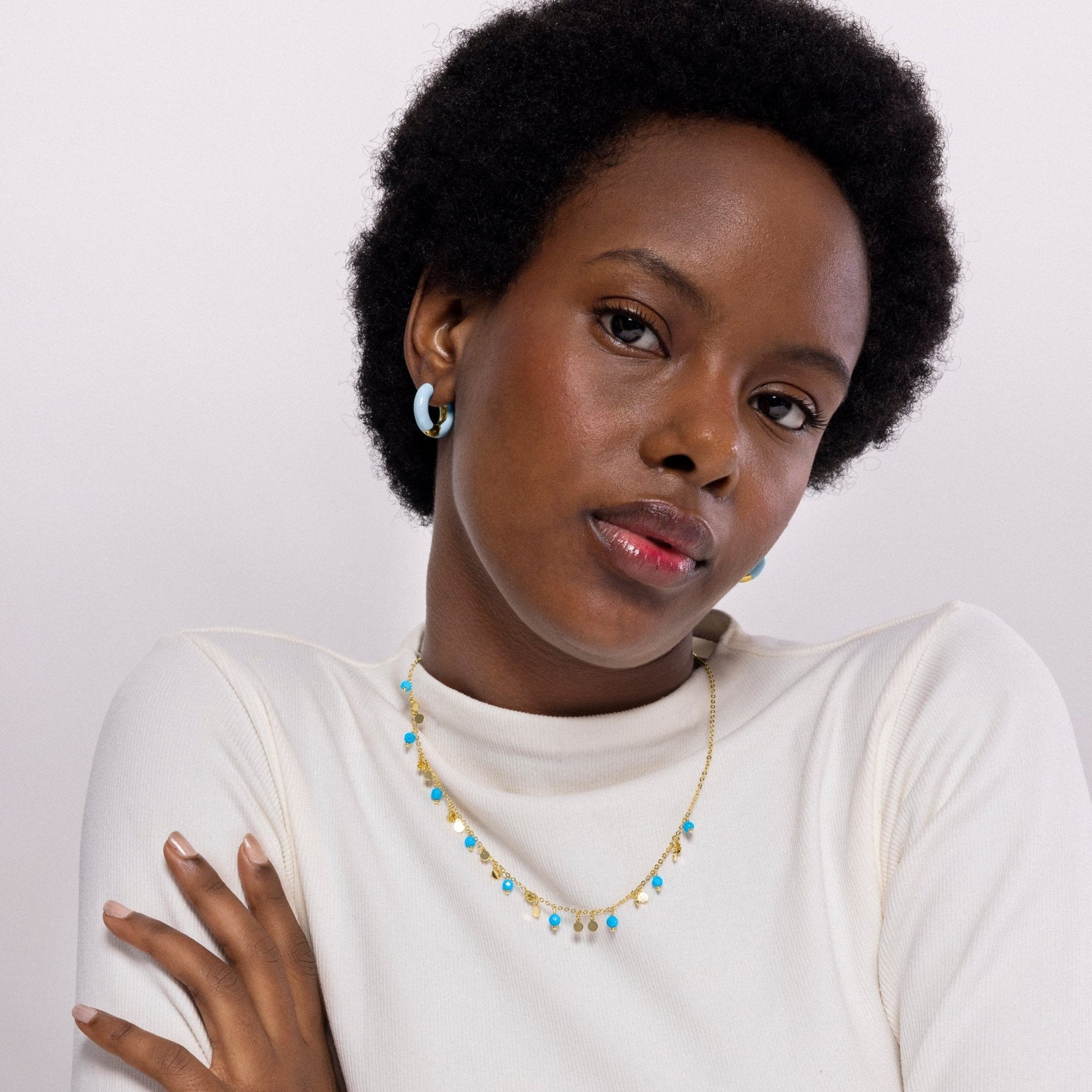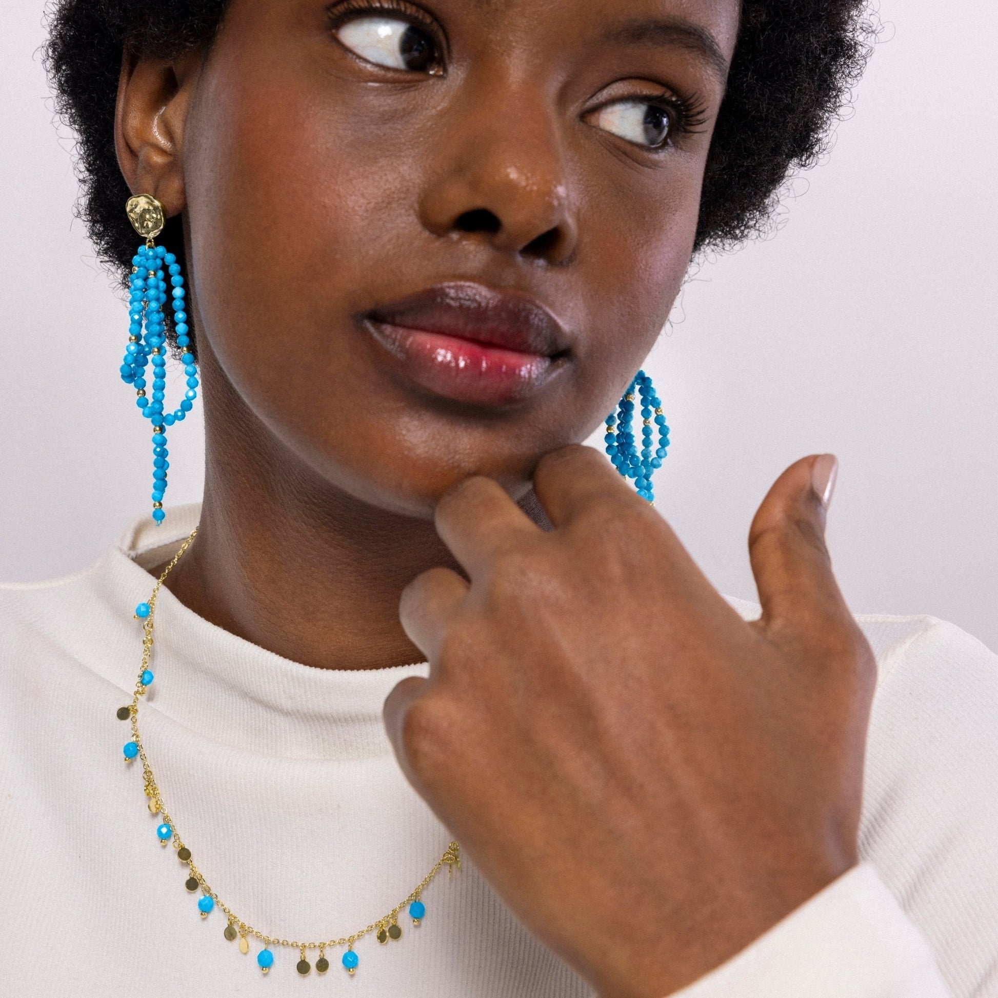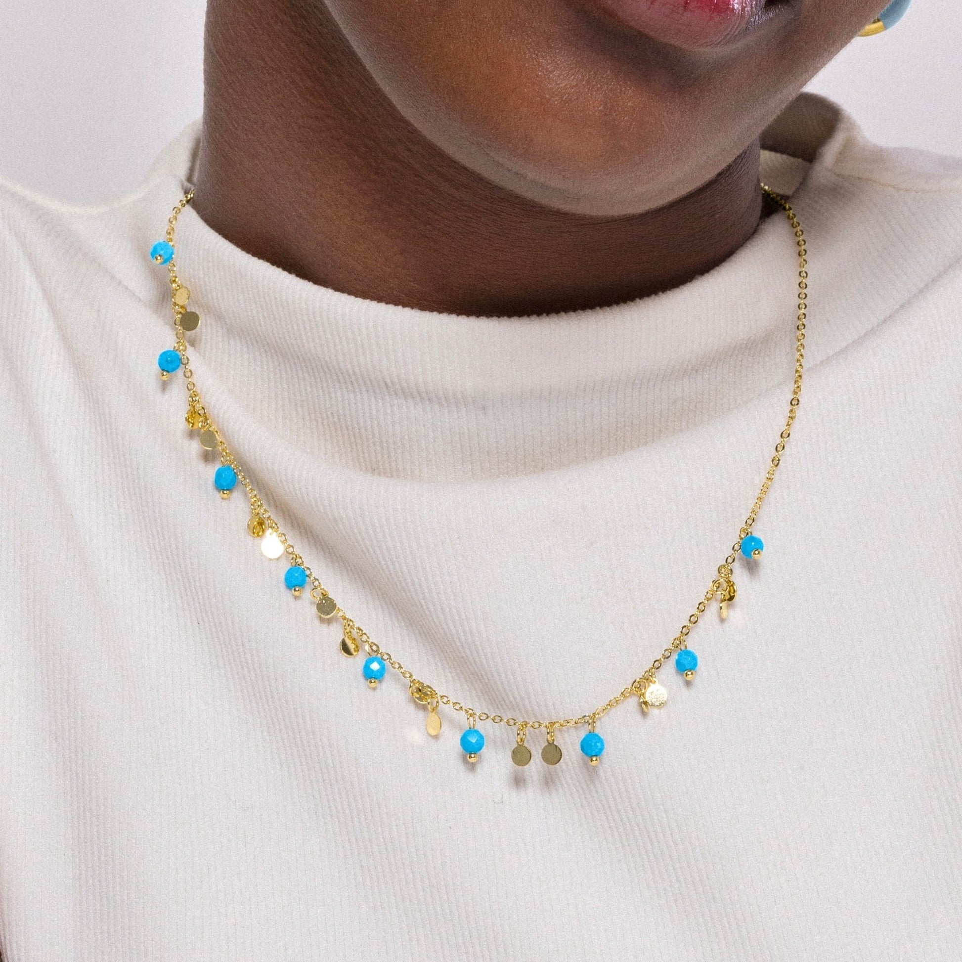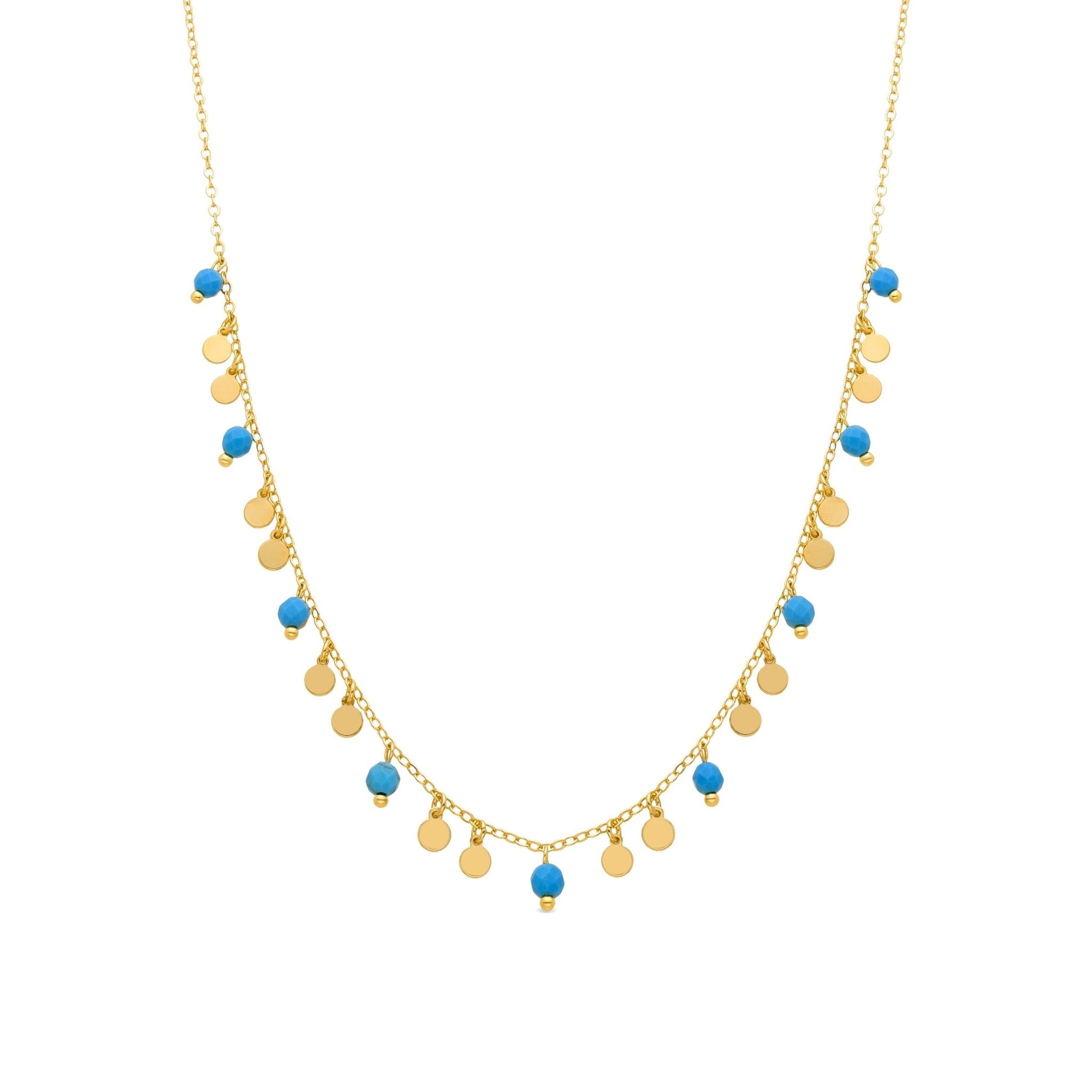 Collar de metal Fawya de Turquesa acabado en oro amarillo de 18k. El estilo Boho es una estética de espíritu libre que mezcla diferentes culturas y expresiones artísticas en un estilo ecléctico con énfasis en los elementos orgánicos y la naturaleza.