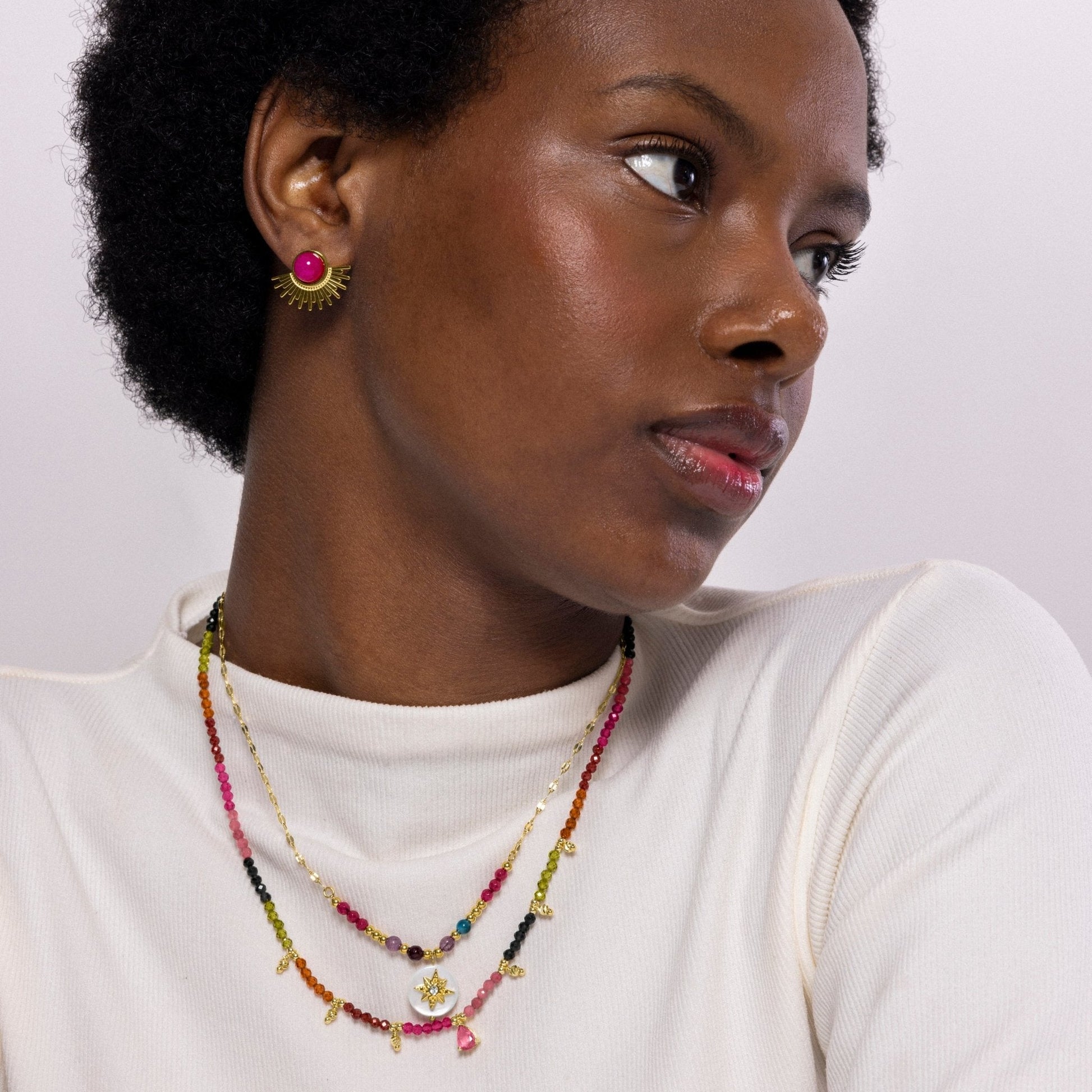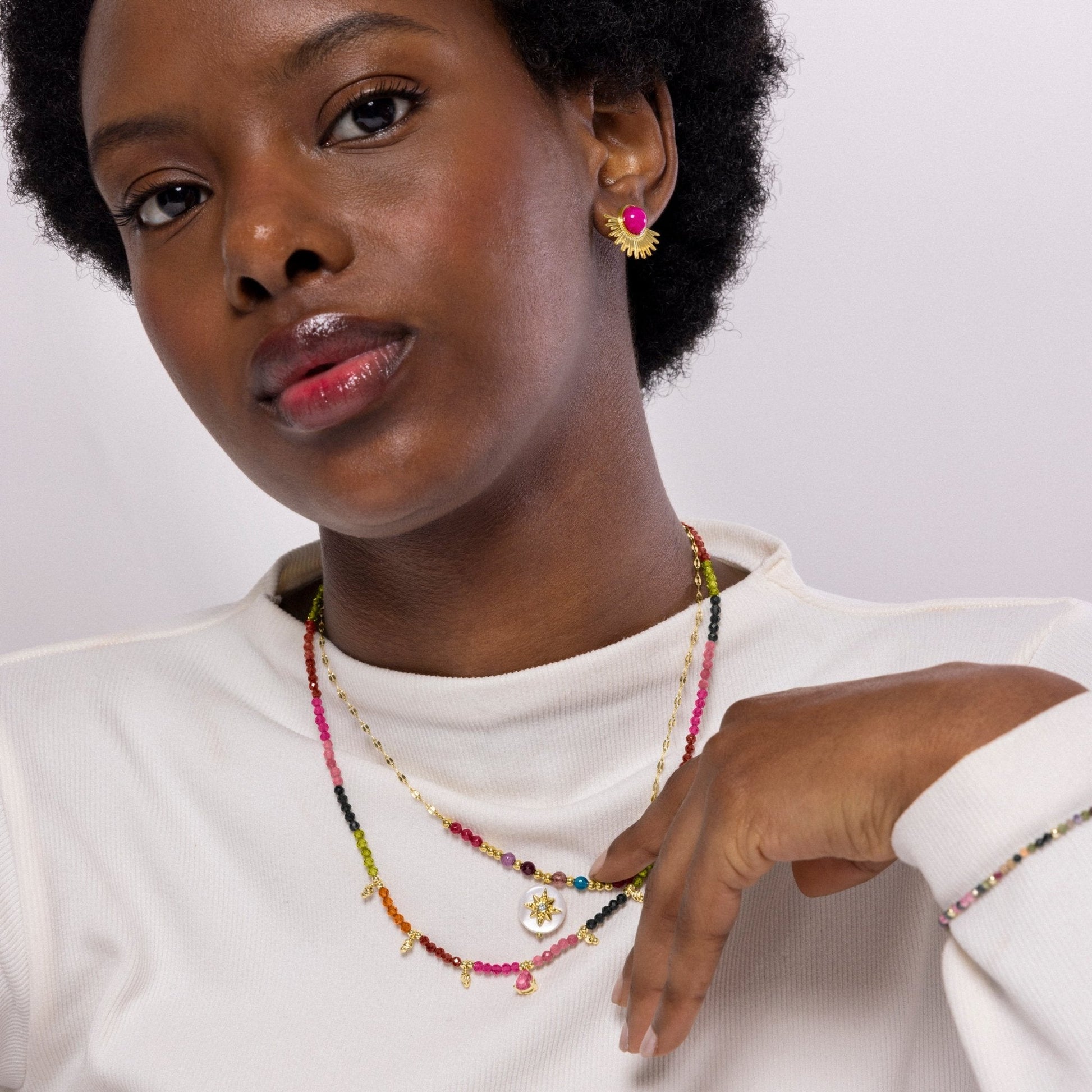 Collar de metal Baim de Turmalina Multicolor acabado en oro amarillo de 18k. El estilo Boho es una estética de espíritu libre que mezcla diferentes culturas y expresiones artísticas en un estilo ecléctico con énfasis en los elementos orgánicos y la naturaleza.