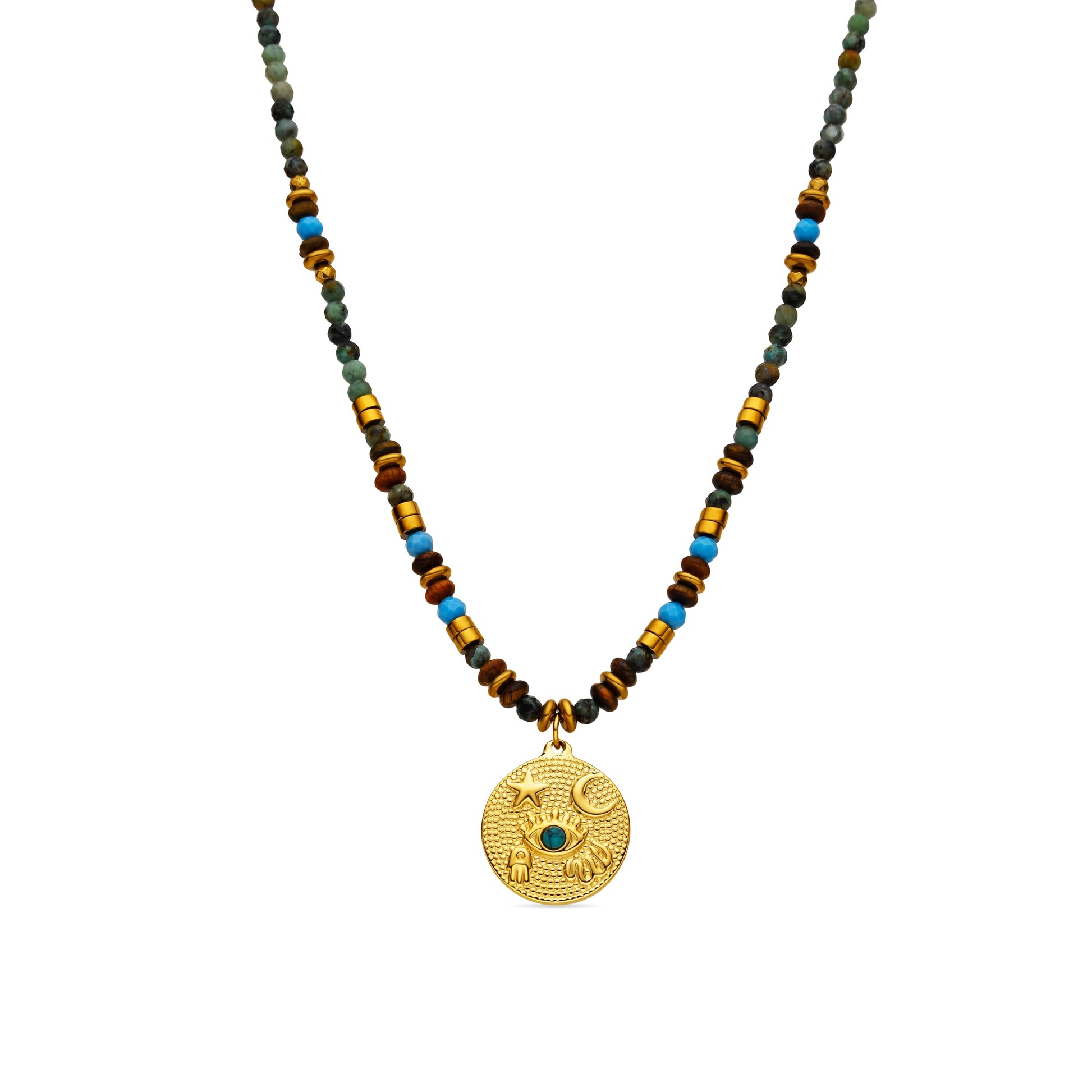 Collar de acero Salki con Multicolor Piedra Natural acabado oro 18k. El estilo Boho es una estética de espíritu libre que mezcla diferentes culturas y expresiones artísticas en un estilo ecléctico con énfasis en los elementos orgánicos y la naturaleza.