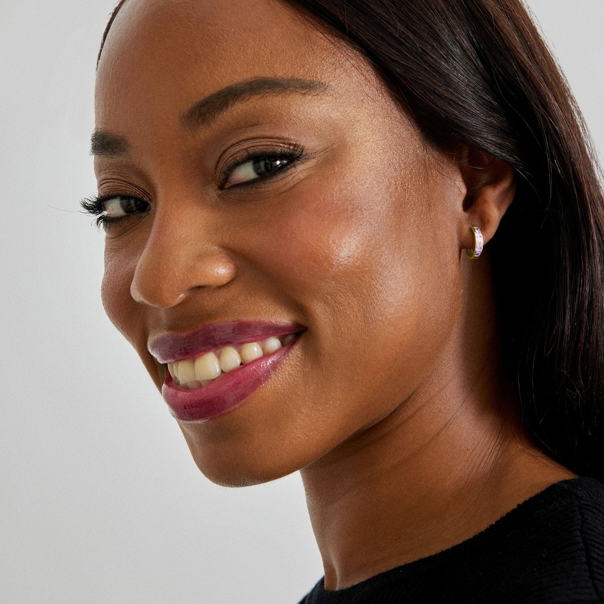 Pendientes Wudya de Circonita Amatista acabados en baño de oro amarillo de 18 quilates. África Basic encarna la sencillez refinada, piezas atemporales con líneas suaves y el brillo adicional de las circonitas. Joyas básicas sin pretensiones que son perfectas para el uso diario, pero también pueden funcionar en ocasiones especiales.