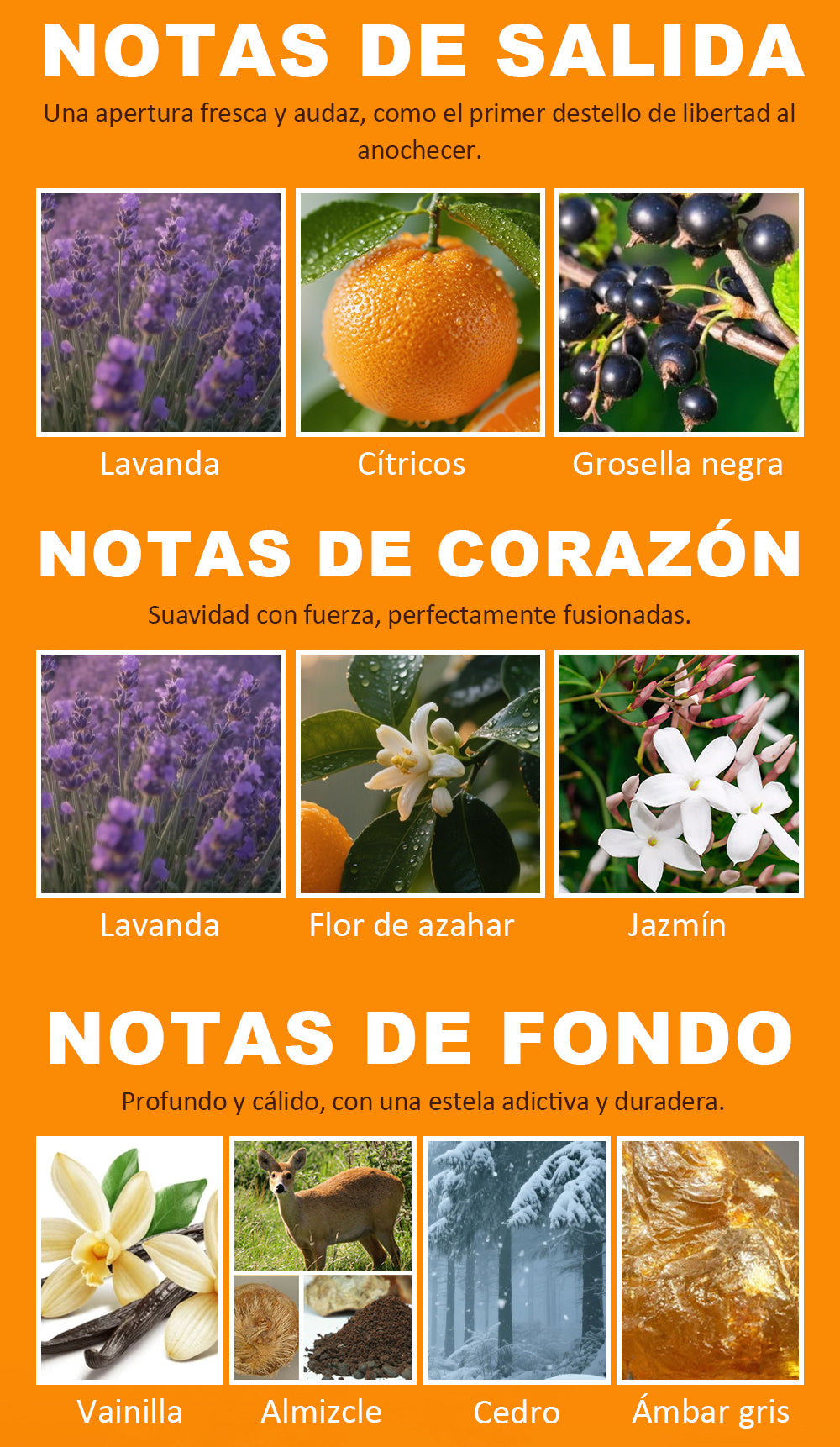 vainilla profunda, almizcle, cedro y un toque de ámbar gris que deja un rastro magnético, poderoso y deliciosamente nocturno.