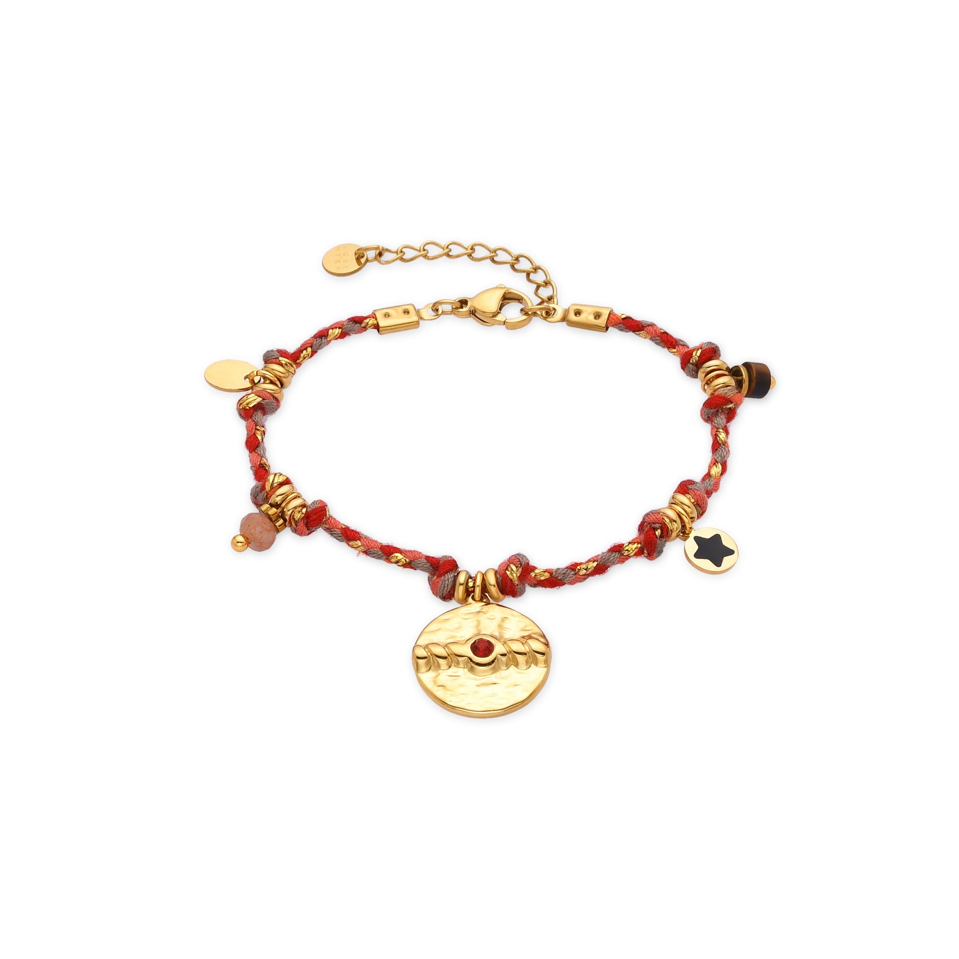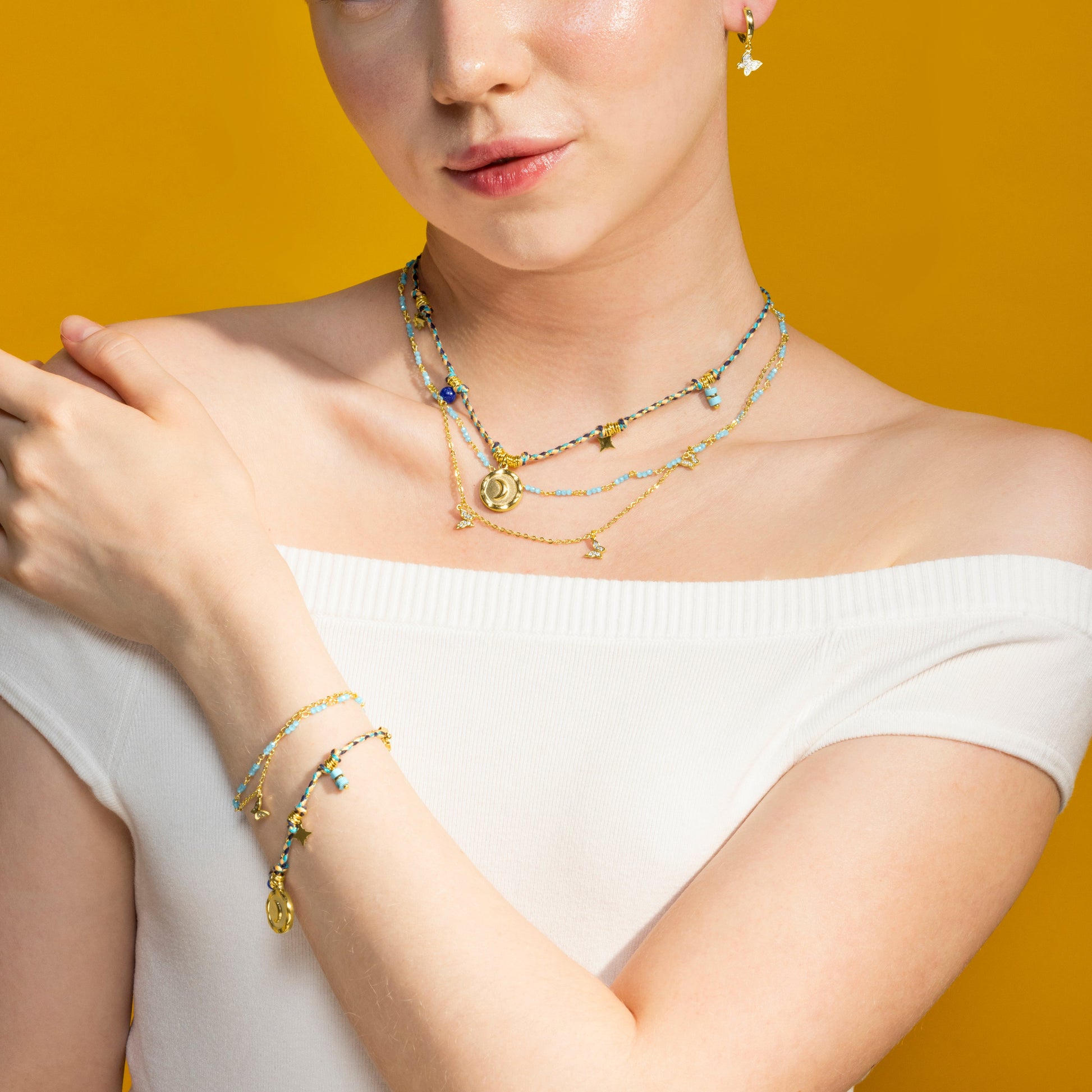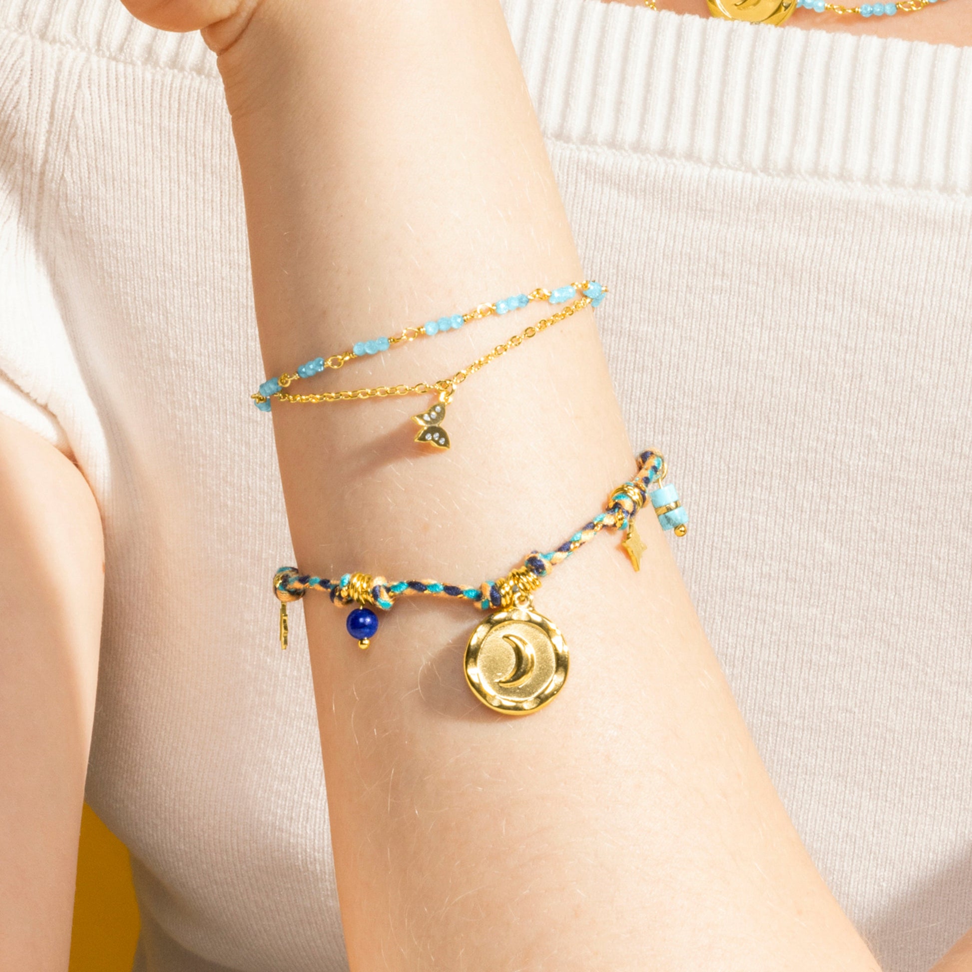 Pulsera de acero Liskel con Cristal Azul Oscuro acabado oro 18k. El estilo Boho es una estética de espíritu libre que mezcla diferentes culturas y expresiones artísticas en un estilo ecléctico con énfasis en los elementos orgánicos y la naturaleza.
